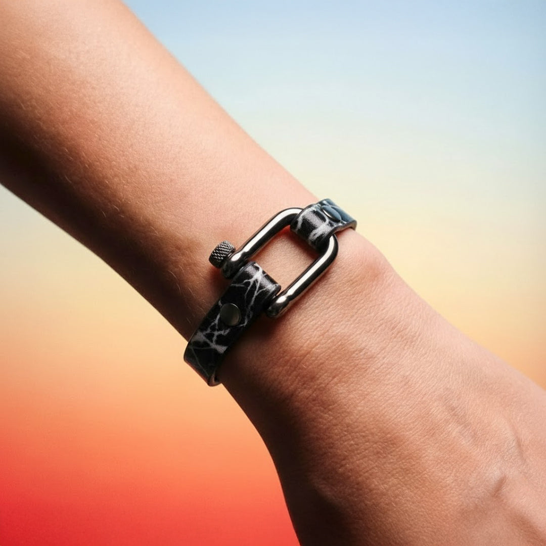 Leather strapped bracelet made using black marble printed tanned calf leather with a stream lined Gun Metal shackle.