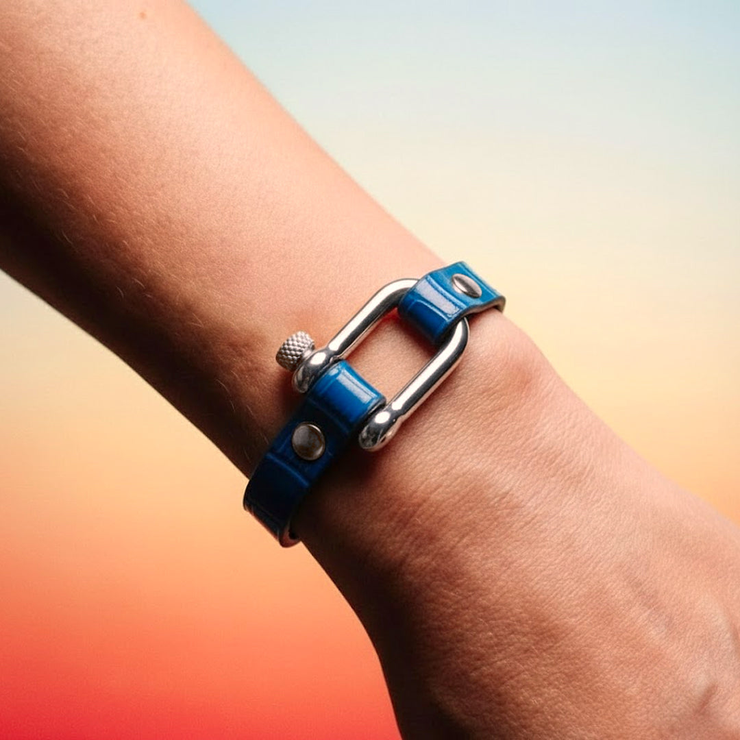 Leather strapped bracelet made using blue tanned calf leather with a stream lined Silver shackle.