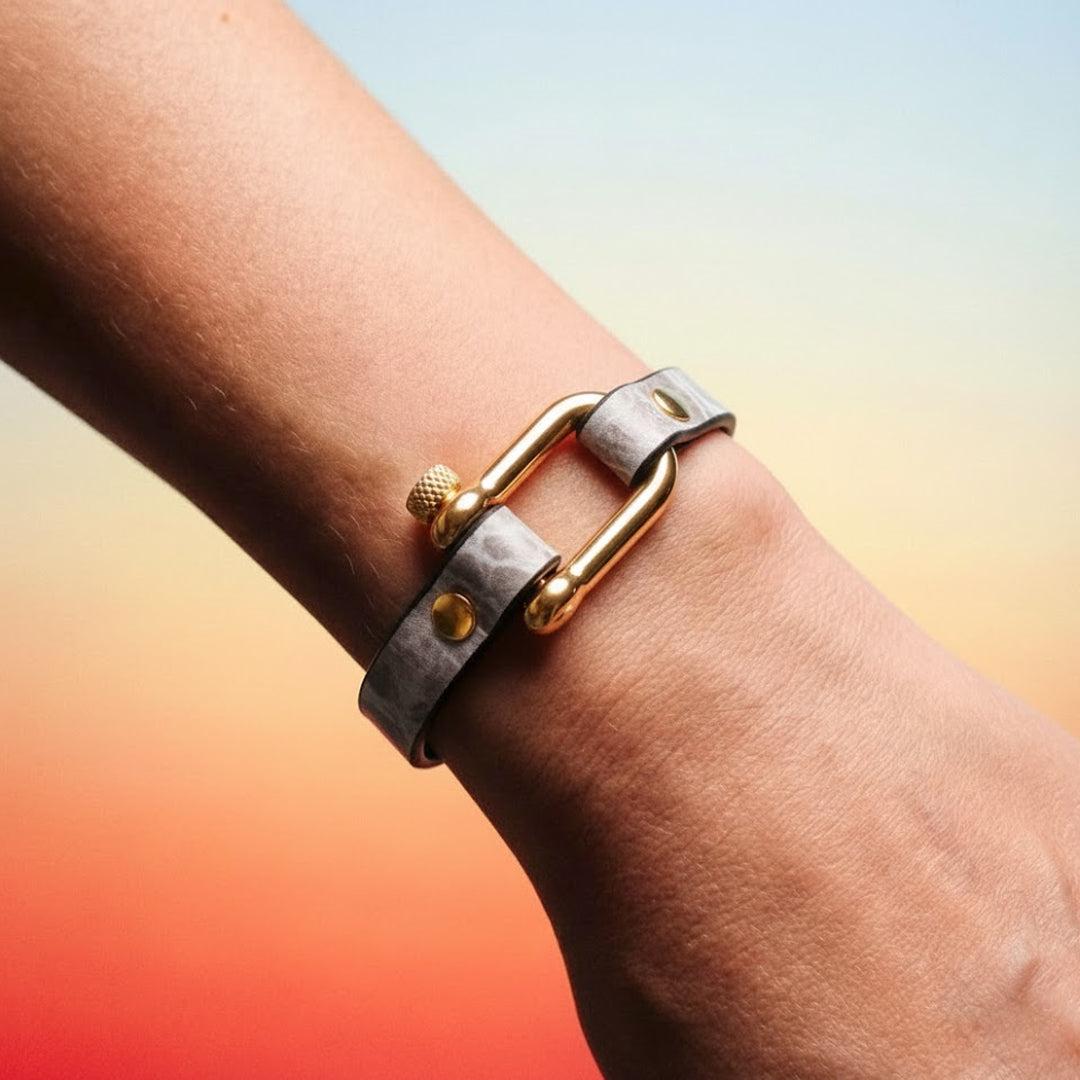 Leather strapped bracelet made using grey marble printed tanned calf leather with a stream lined Gold shackle.