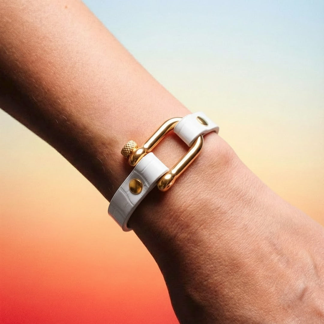 Leather strapped bracelet made using white tanned calf leather with a stream lined Gold shackle.