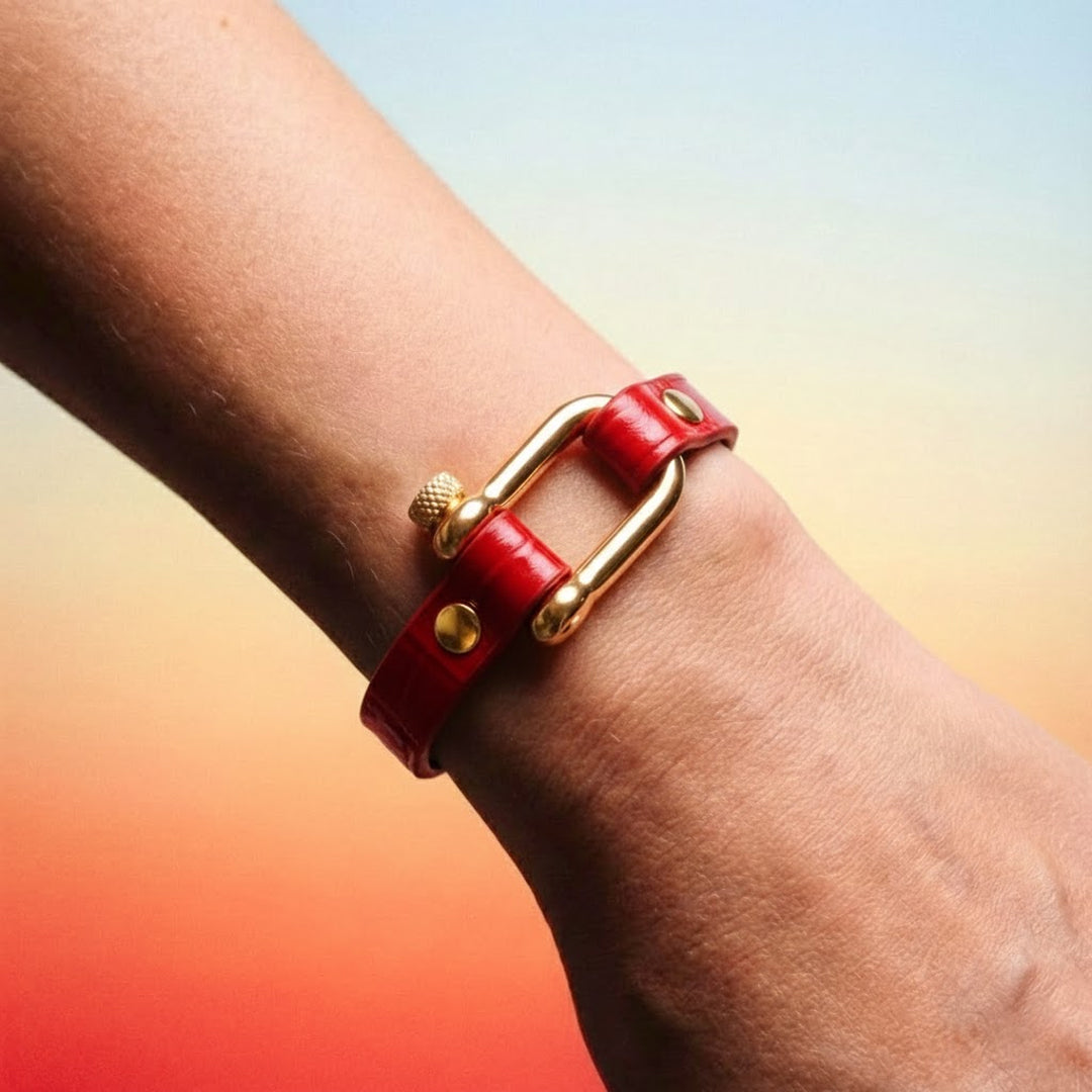 Leather strapped bracelet made using red tanned calf leather with a stream lined Gold shackle.