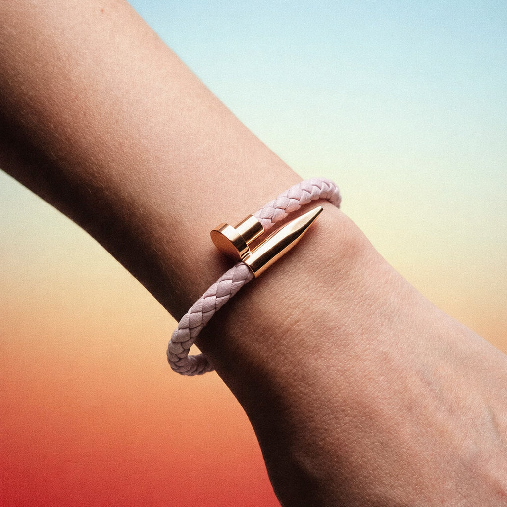 Nail shaped bracelet combining braided pink leather with the classic luxury of rose gold.