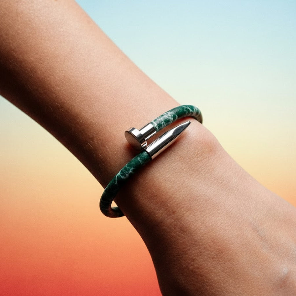 Nail shaped bracelet combining Green Marble printed leather with the minimalism of finely polished stainless steel.