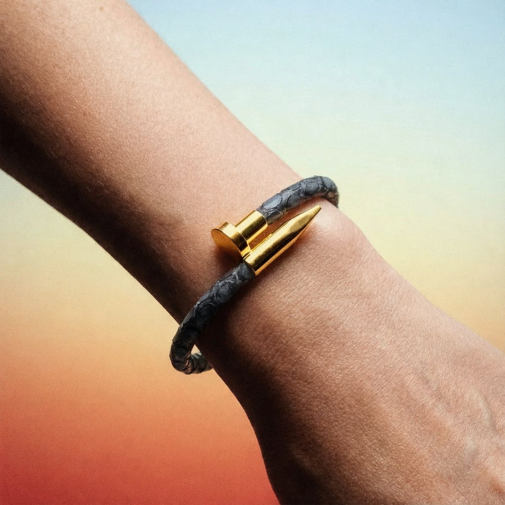 Nail shaped bracelet with bold texture of grey python skin and the classic luxury of gold.
