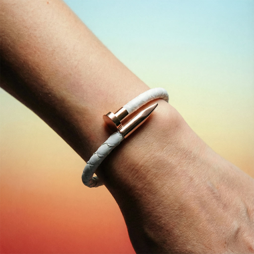 Nail shaped bracelet with bold texture of white python skin and the classic luxury of Rose Gold.